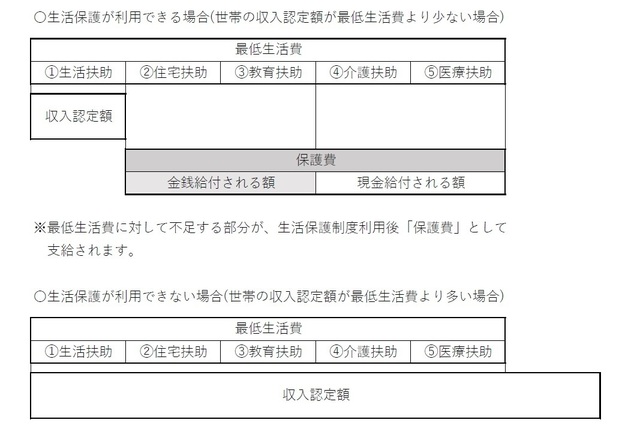 国が定めた生活保護の基準(最低生活費)と、世帯の収入(預貯金などの資産を含む)とを比べて、収入が最低生活費を下回っていれば保護を受けることができます。なお、生活保護費は、生計をともにする人の集まりである「世帯」を単位として行われます。
