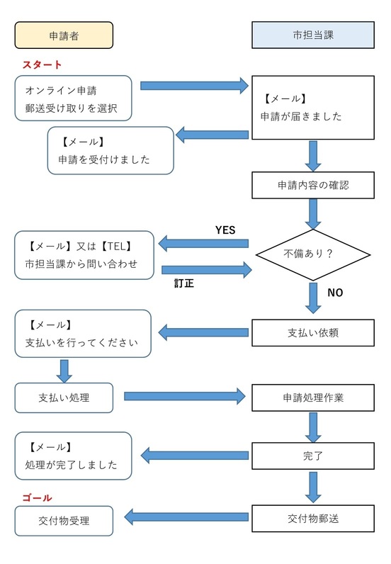 なお、従来通りのオンライン申請を行い、受け取りとお支払いを市役所窓口で行う方法も引き続き行っております。