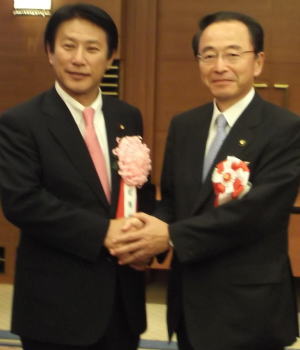 市長在職20年を超え総務大臣表彰を受賞し、樽床伸二総務大臣と握手をする速水市長