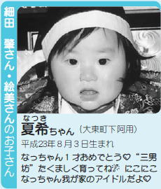 写真に(1)お子さんの名前(ふりがな)、(2)お子さんの誕生日、(3)ご両親の名前(ふりがな)、(4)住所、(5)電話番号、(6)コメント(40字程度)を添え、郵便またはE-Mailで8月9日(木曜)までに情報政策課へお送りください。