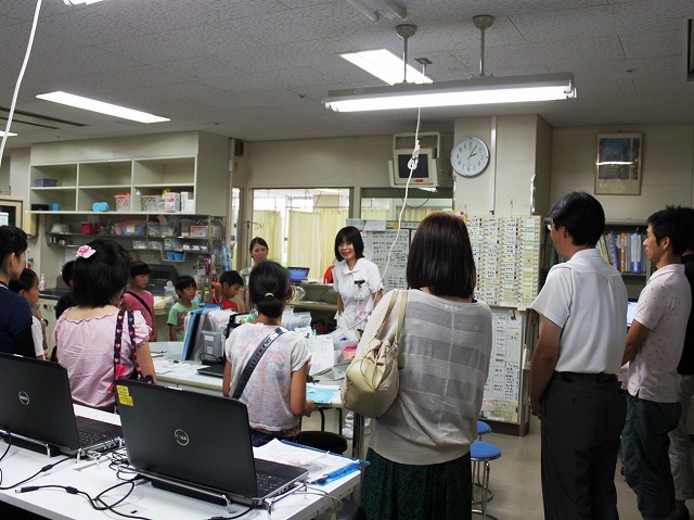 8月25日、西日登小学校では3年生の親子活動として病院見学会が行われました。児童8人、保護者7人、担任の先生1人、あわせて16人の皆さんが、院内の見学や体験をされました。