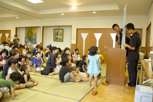 大東高校の男子生徒たちは、加茂町の「子育て環境」に焦点を当て、子どもたちと触れ合うことでより良い子育て環境づくりを考えるきっかけにしようと企画され、イベントには親子連れ約70人の参加があり、屋外のビニールプールでの水あそびや高校生による絵本の読み語りで高校生たちは子どもたちとふれあいました。